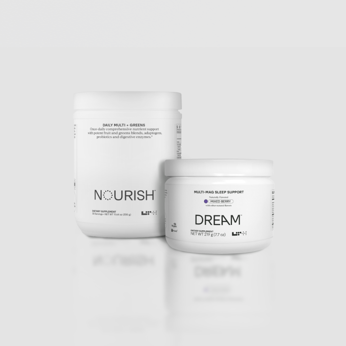 Energize your mornings with LTH Nourish Daily Multi + Greens and unwind at night with LTH Dream, a calming blend for deep, restorative sleep.