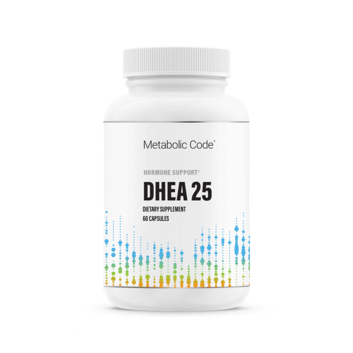 Micronized DHEA 25 by Metabolic Code delivers 25 mg of micronized dehydroepiandrosterone in each capsule to support hormonal balance, adrenal function, and healthy aging. This higher-dose formula is ideal for individuals requiring greater DHEA support under the guidance of a healthcare provider.