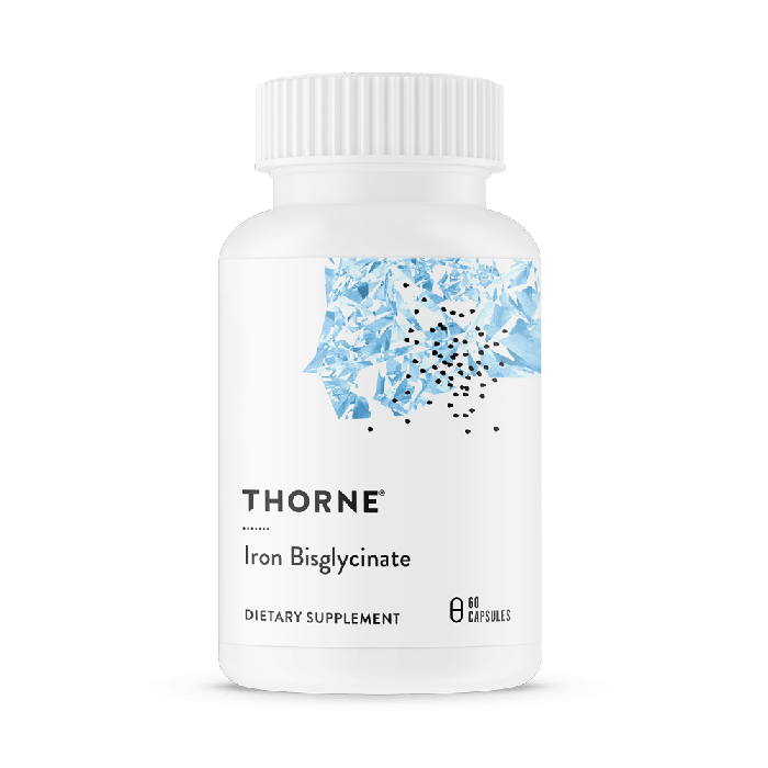 Thorne's Iron Bisgylcinate is NSF Certified for Sport®. It is essential for the formation of red blood cells.* The U.S. Centers for Disease Control has determined that the prevalence of iron deficiency is greatest among toddlers (7% of those ages 1-2 years) and menstruating adolescent and adult females (9-16 % of individuals ages 12-49, whether they are athletes or not. Conventional iron supplementation, including forms such as ferrous sulfate, can cause gastrointestinal side effects – including nausea, vomiting, constipation, diarrhea, and dark-colored stools – because these conventional forms of iron are poorly absorbed. Thorne's Iron Bisglycinate provides 25 mg of elemental iron per capsule that has been reacted with glycine for optimal absorption in the gastrointestinal tract, thus helping to decrease the typical gastrointestinal side effects.*