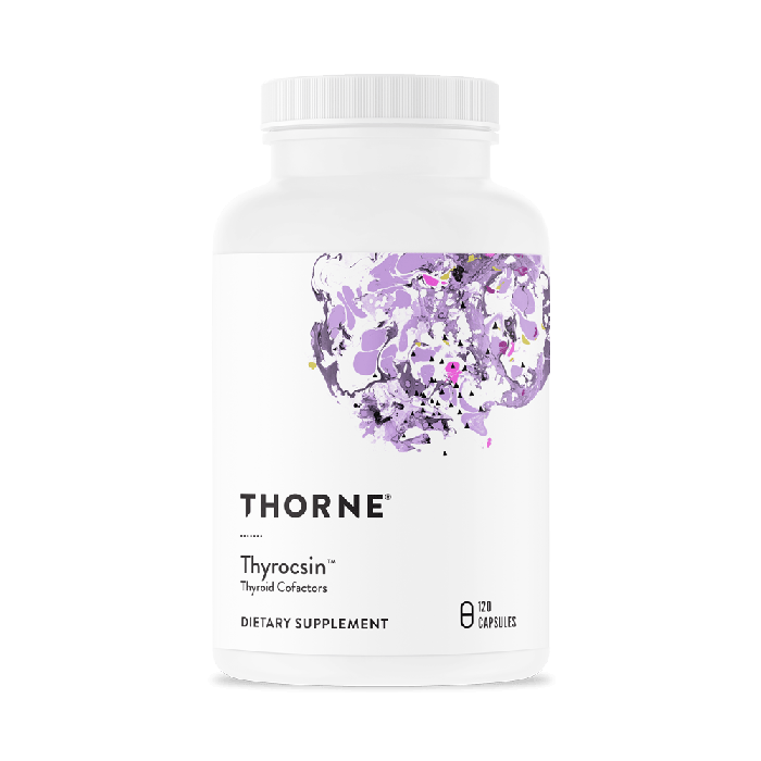 Thorne's Thyrocsin formula contains key ingredients for thyroid support, including iodine, which is necessary for formation of T4, and L-tyrosine, which is a necessary component of both T4 and T3 formation.* Animal studies have indicated that the Ayurvedic botanical, ashwagandha, can increase T4 concentrations.* Thyrocsin also includes several nutrient cofactors necessary for converting T4 to T3, including the minerals selenium, zinc, and copper.* Thyrocsin includes vitamin B12 because a deficiency of this vitamin appears to interfere with the activity of thyroid hormones.* Conversion of T4 to T3 can be inhibited by heavy metal toxicity and lipid peroxidation; hence, the inclusion of antioxidant vitamins C and E to counterbalance this inhibition.*