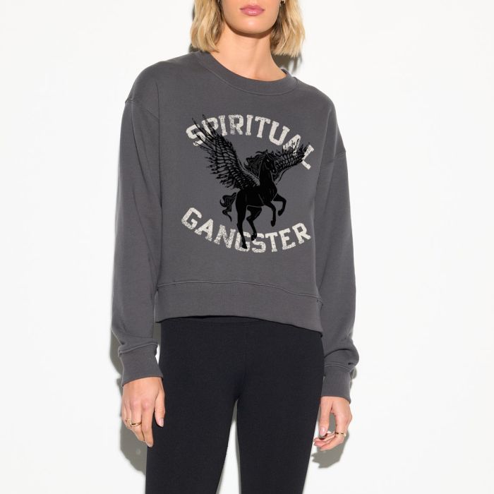 Elevate your everyday essentials with the Pegasus Sublime Crew in Ash. Featuring a vintage-inspired graphic of a soaring Pegasus, this crewneck pullover channels bold energy and movement with a grounded, spiritual vibe. Perfect for layering post-workout or pairing with your favorite high-rise leggings for off-duty days.